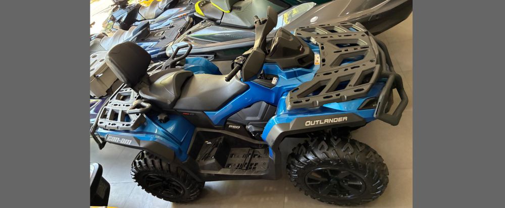 Quadriciclo Can-Am Outlander Max 850 ano 2023, com apenas 43 horas/747 km de uso. Equipado com motor ACE de 850 cc, Direção Dinâmica Assistida (DPS), guincho, engate, rodas de liga-leve, pára-choques, protetor de manoplas, faróis em Led, pintura metálica, além de muito mais! Venha ver de perto!