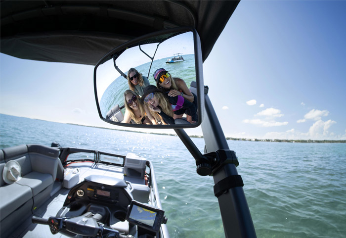O modelo Sport apresenta detalhes esportivos especiais, como capacidade para até 8 pessoas, amplo deck para descanso com encostos e protetores contra sol, suporte inflável de engate rápido, espelhos retrovisores para acompanhar as manobras de wake e muito, muito mais.